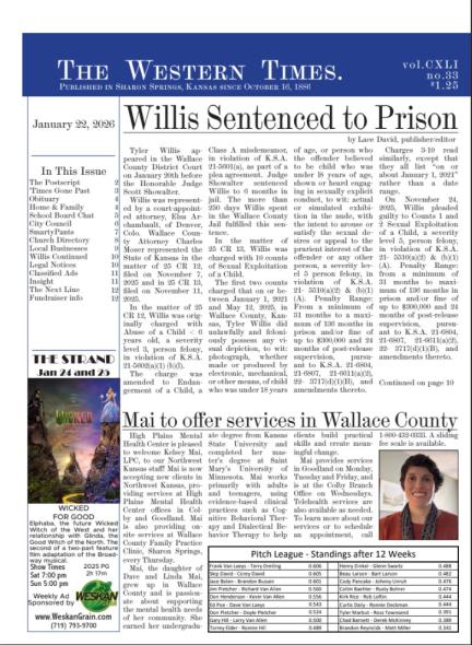 Tyler Willis appeared in the Wallace County District Court on January 20th before the Honorable Judge Scott Showalter. Willis was represented by a court-appointed attorney, Elsa Archambault, of Denver, Colo. Wallace County Attorney Charles Moser represented the State of Kansas... [More]